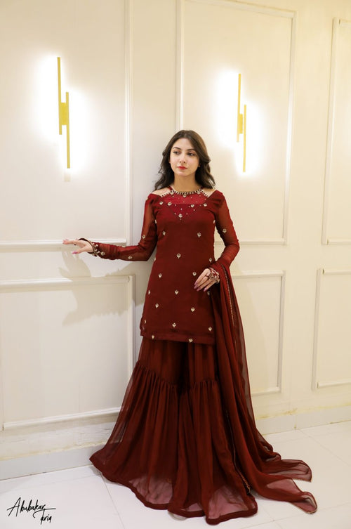 3pc Handwork Heavy Flare Maxi Maroon-Color